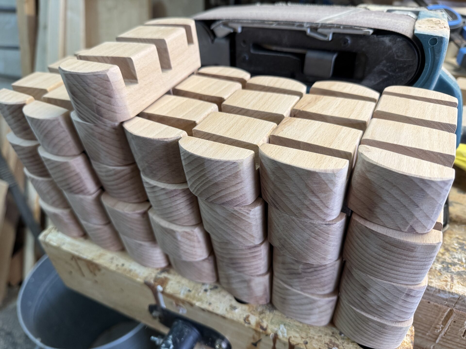 Ze vroegen om 60 stuks maar omdat ik mezelf ken, ben ik begonnen met 70 blokjes te zagen. In die blokjes moesten 3 gleuven komen, maar elke gleuf moest anders zijn. Niet alleen qua vorm maar ook qua diepte. Een vork heeft natuurlijk een andere vorm dan een mes, maar een mes is ook weer dikker. En als je dan 3 van elk wil indekken, moet het gat van het mes dieper worden dan die van de vork. Het is niet moeilijk, maar het vergt wel denkwerk, en natuurlijk veel precisie.