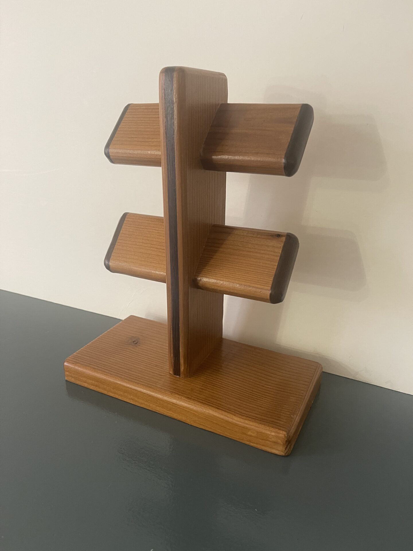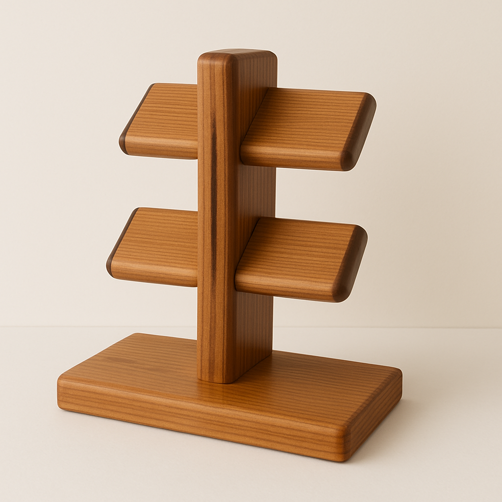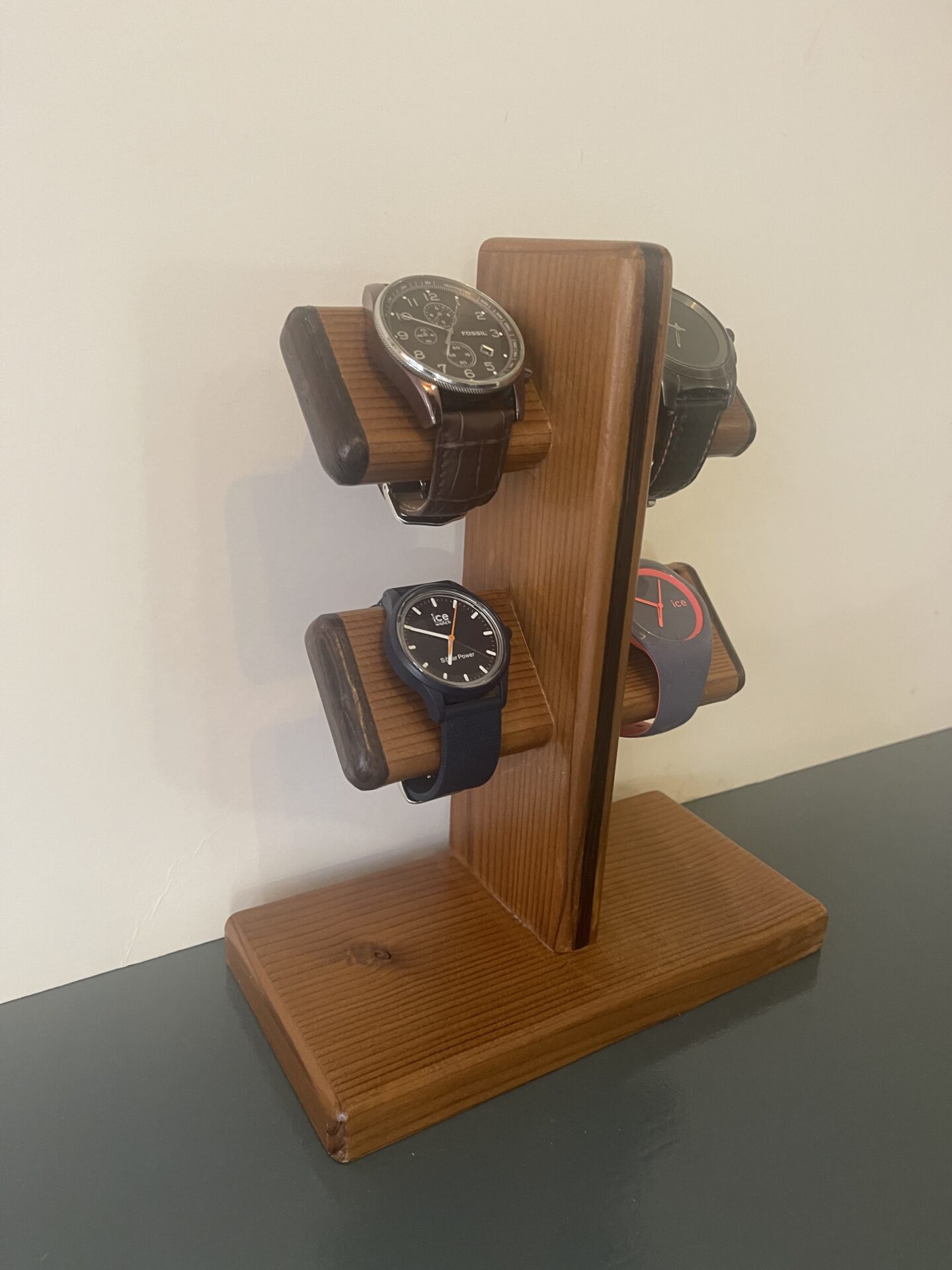 Een stijlvolle, handgemaakte horlogestandaard van massief hout.